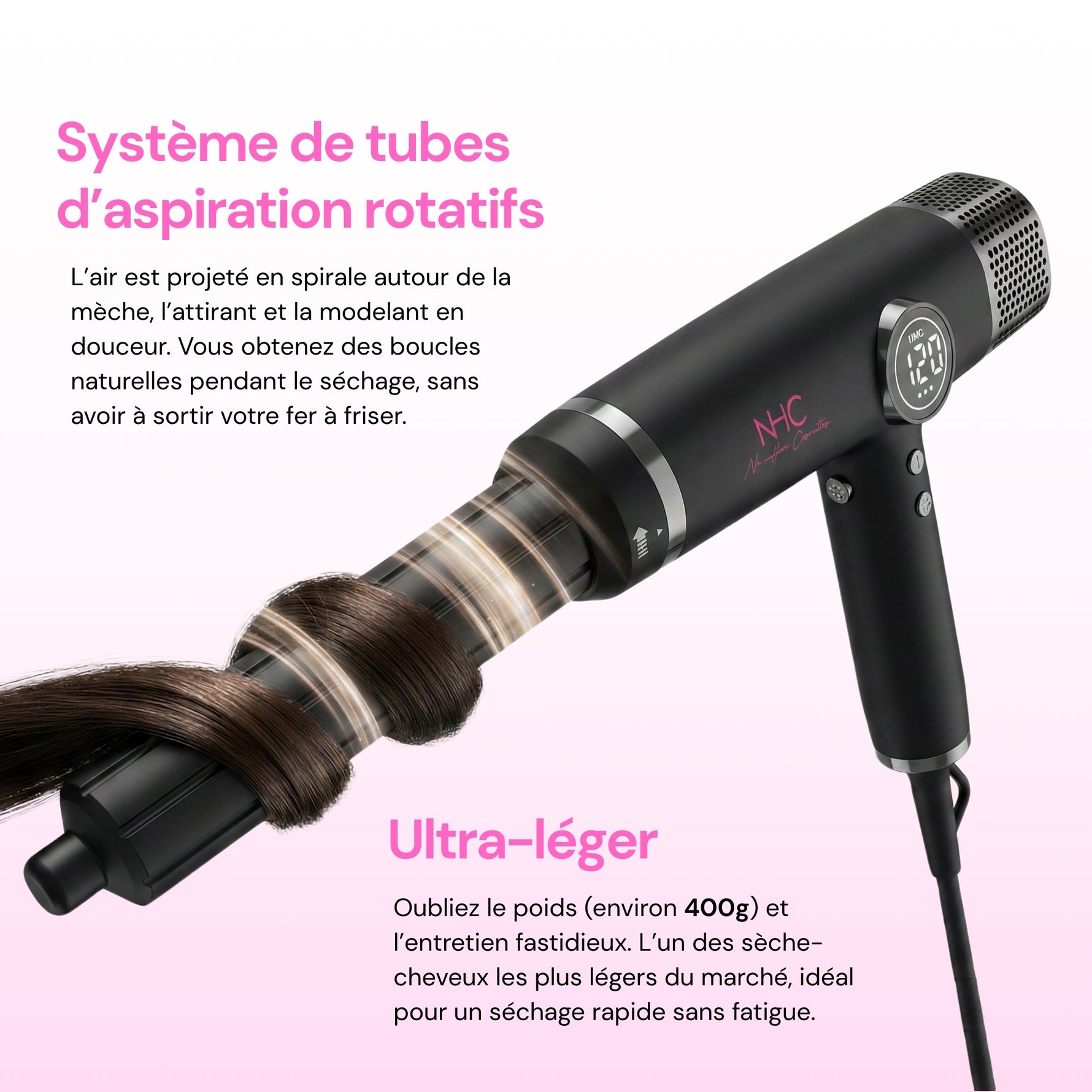 Grâce à le système de tubes d’aspiration rotatifs, l’air est projeté en spirale autour de la mèche, l’attirant et la modelant en douceur.